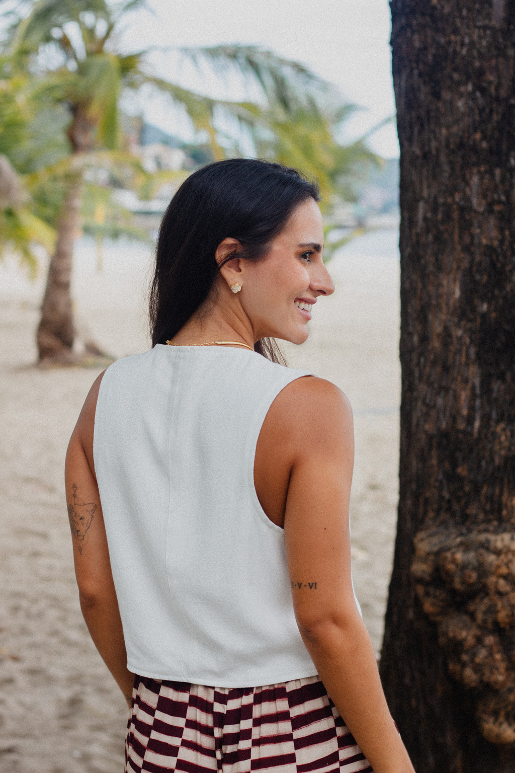 Descubra o charme e a versatilidade do Colete Liza, confeccionado em linho com viscose. Com um decote em V que valoriza o colo e uma frente totalmente forrada, este colete é perfeito para compor looks sofisticados. As costas fechadas garantem uma silhueta elegante, enquanto os três botões frontais de madeira adicionam um toque rústico e encantador à peça.